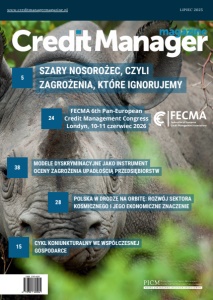 38 5 15 MODELE DYSKRYMINACYJNE JAKO INSTRUMENT OCENY ZAGROŻENIA UPADŁOŚCIĄ PRZEDSIĘBIORSTW LIPIEC 2025 www.creditmanagermagazine.pl CYKL KONIUNKTURALNY WE WSPÓŁCZESNEJ GOSPODARCE SZARY NOSOROŻEC, CZYLI ZAGROŻENIA, KTÓRE IGNORUJEMY 28 POLSKA W DRODZE NA ORBITĘ: ROZWÓJ SEKTORA KOSMICZNEGO I JEGO EKONOMICZNE ZNACZENIE 24 FECMA 6th Pan-European Credit Management Congress Londyn, 10-11 czerwiec 2026